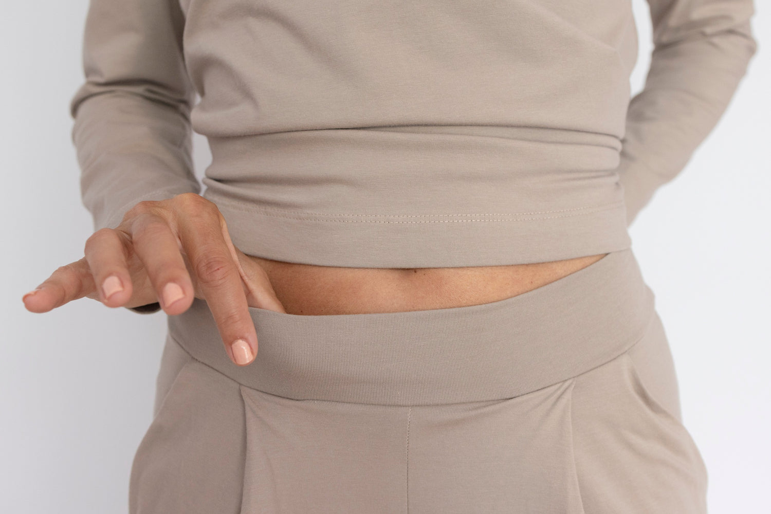 Cinturilla exclusiva Permiso, que protege y abriga tus lumbares y tu abdomen, pero sin apretar. Las tobilleras mantienen en su sitio el pantalón durante la noche y cuando haces yoga, pilates o ejercicio con él.